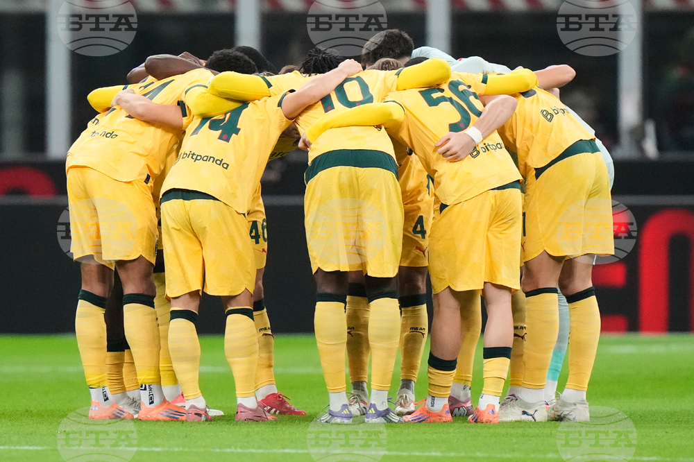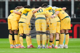 AC Milan's players huddle prior to a Serie A soccer match between AC Milan and Fiorentina, in Milan, Italy, Sunday, Oct. 19, 2025. (AP Photo/Luca Bruno)