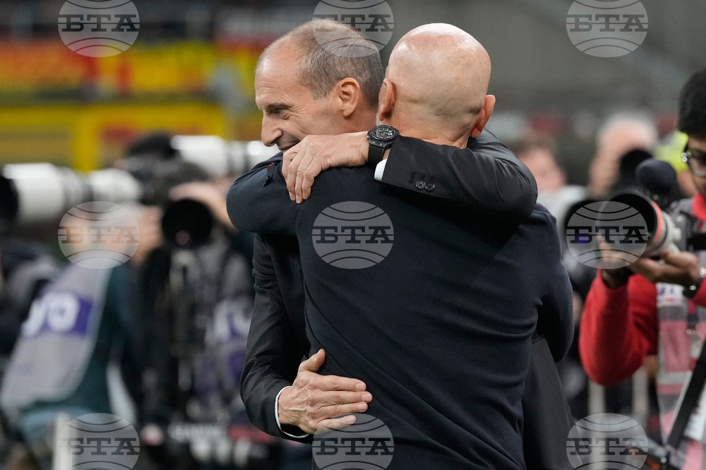 Fiorentina's head coach Stefano Pioli, front, greets AC Milan's head coach Massimiliano Allegri prior to a Serie A soccer match between AC Milan and Fiorentina, in Milan, Italy, Sunday, Oct. 19, 2025. (AP Photo/Luca Bruno)