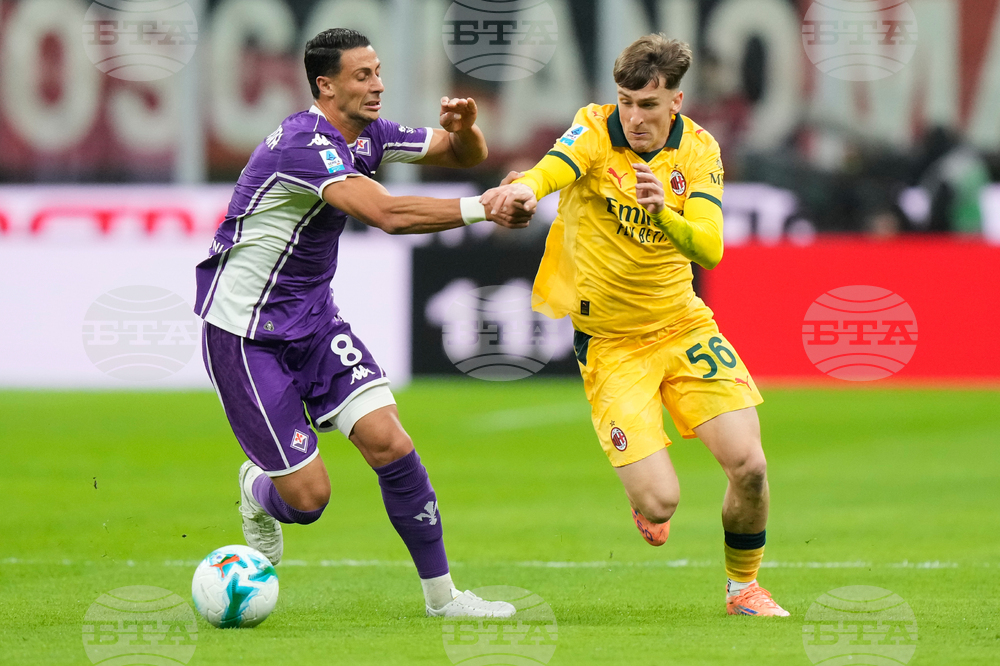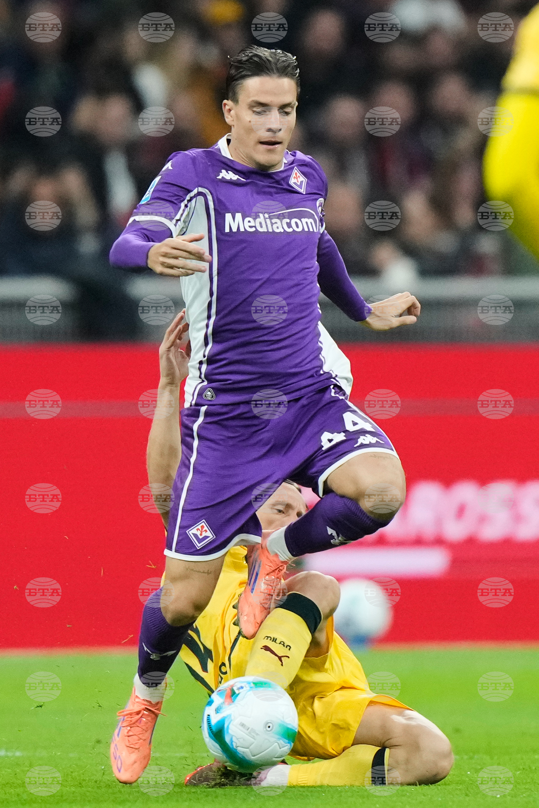 Fiorentina's Nicolo Fagioli, left, and AC Milan's Youssouf Fofana vie for the ball during a Serie A soccer match between AC Milan and Fiorentina, in Milan, Italy, Sunday, Oct. 19, 2025. (AP Photo/Luca Bruno)