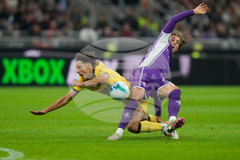 Fiorentina's Nicolo Fagioli, front, is challenged by AC Milan's Luka Modric during a Serie A soccer match between AC Milan and Fiorentina, in Milan, Italy, Sunday, Oct. 19, 2025. (AP Photo/Luca Bruno)