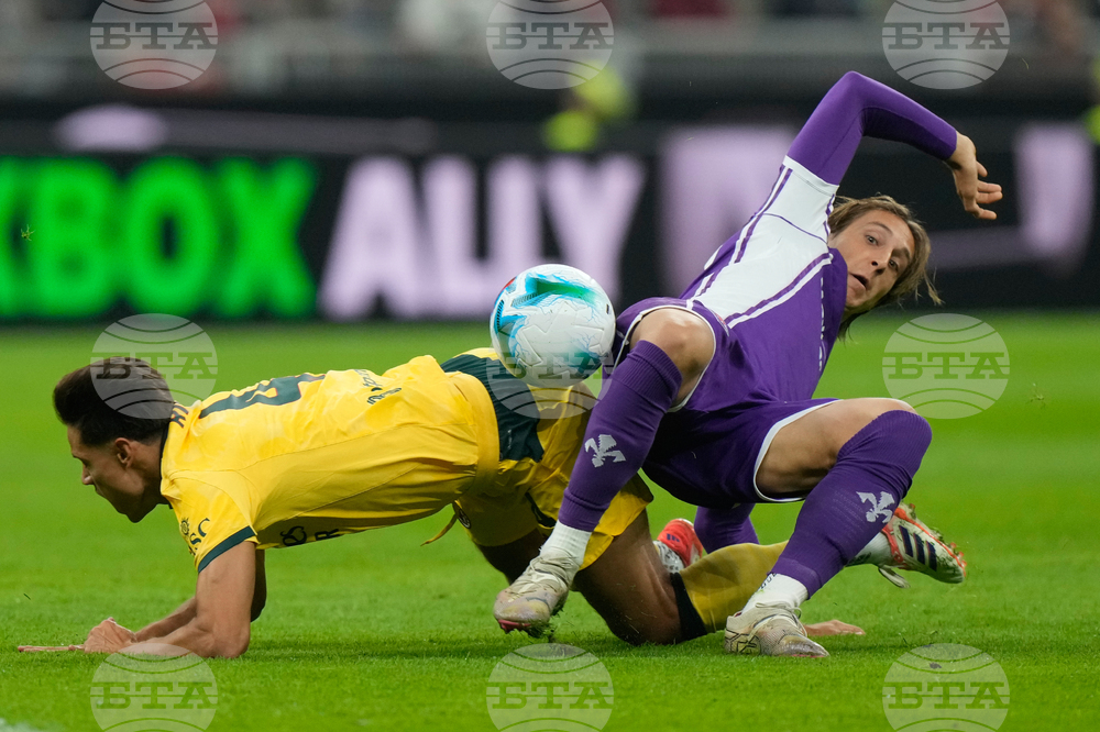 Fiorentina's Jacopo Fazzini, right, and AC Milan's Samuele Ricci fight for the ball during a Serie A soccer match between AC Milan and Fiorentina, in Milan, Italy, Sunday, Oct. 19, 2025. (AP Photo/Luca Bruno)