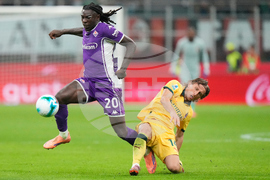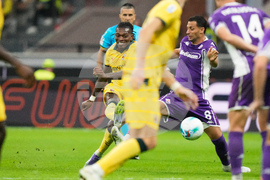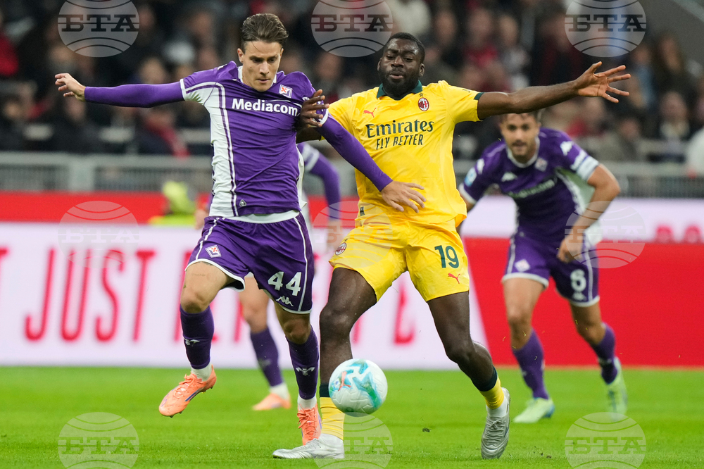 Fiorentina's Dodo, left, clears the ball past AC Milan's Fikayo Tomori during a Serie A soccer match between AC Milan and Fiorentina, in Milan, Italy, Sunday, Oct. 19, 2025. (AP Photo/Luca Bruno)