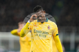 AC Milan's Rafael Leao reacts during a Serie A soccer match between AC Milan and Fiorentina in Milan, Italy, Sunday, Oct. 19, 2025. (AP Photo/Luca Bruno)