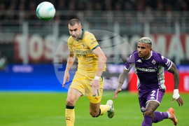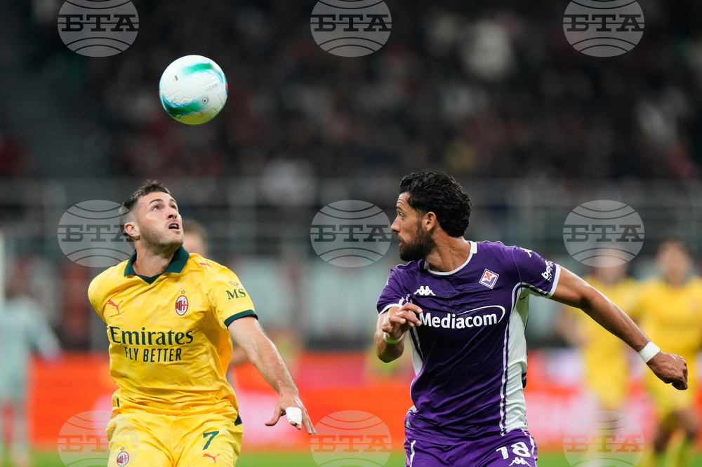 Fiorentina's Rolando Mandragora, left, and AC Milan's Alexis Saelemaekers vie for the ball during a Serie A soccer match between AC Milan and Fiorentina, in Milan, Italy, Sunday, Oct. 19, 2025. (AP Photo/Luca Bruno)