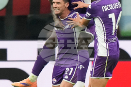 Fiorentina's Robin Gosens (21) is congratulated after scoring his side's opening goal during a Serie A soccer match between AC Milan and Fiorentina in Milan, Italy, Sunday, Oct. 19, 2025. (AP Photo/Luca Bruno)