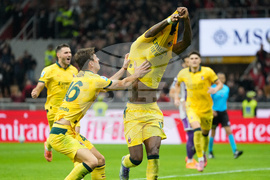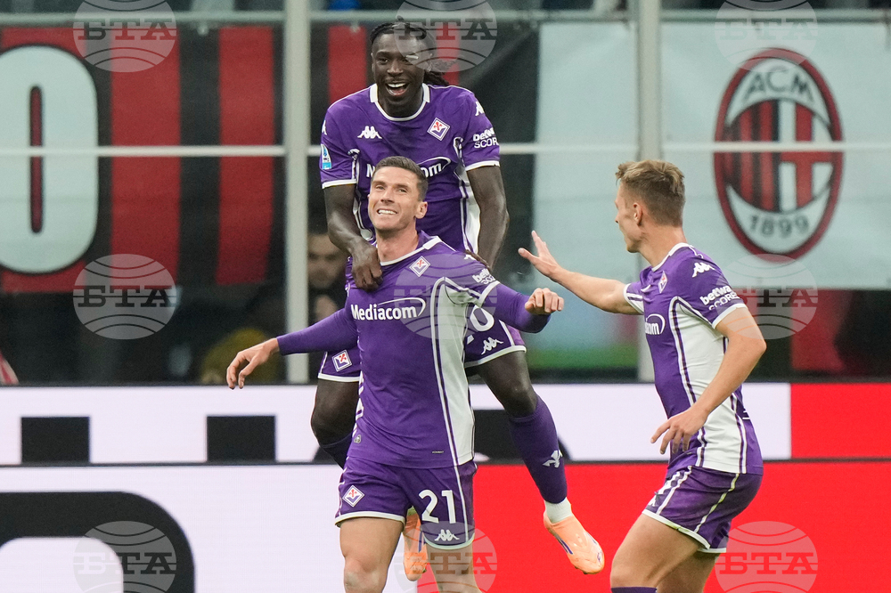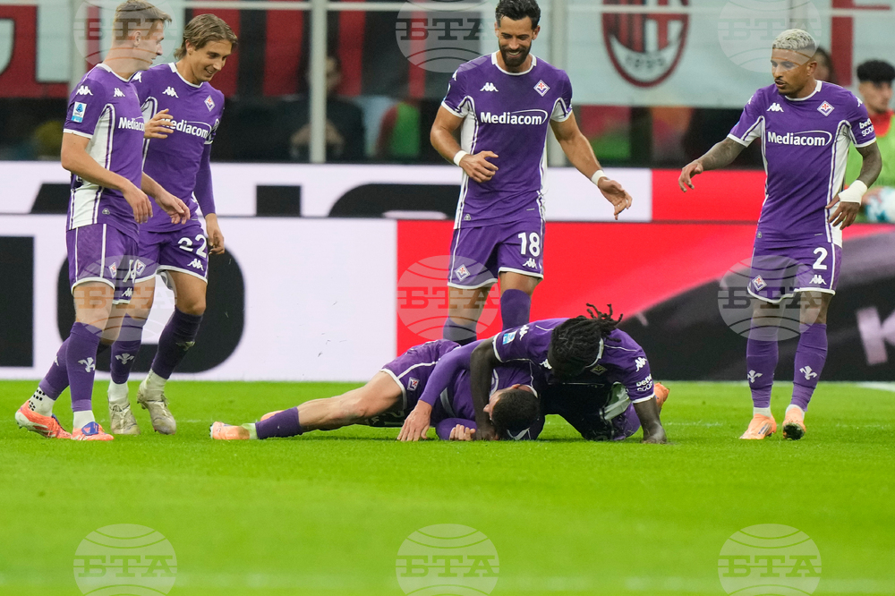 Fiorentina's Robin Gosens, left bottom, is congratulated after scoring his side's opening goal during a Serie A soccer match between AC Milan and Fiorentina in Milan, Italy, Sunday, Oct. 19, 2025. (AP Photo/Luca Bruno)