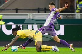 Atalanta's Charles De Ketelaere, left, and Lazio's Nuno Tavares in action during the Serie A soccer match between Atalanta B.C. and S.S. Lazio in Bergamo, Italy, Sunday Oct. 19, 2025. (Stefano Nicoli/LaPresse via AP)
