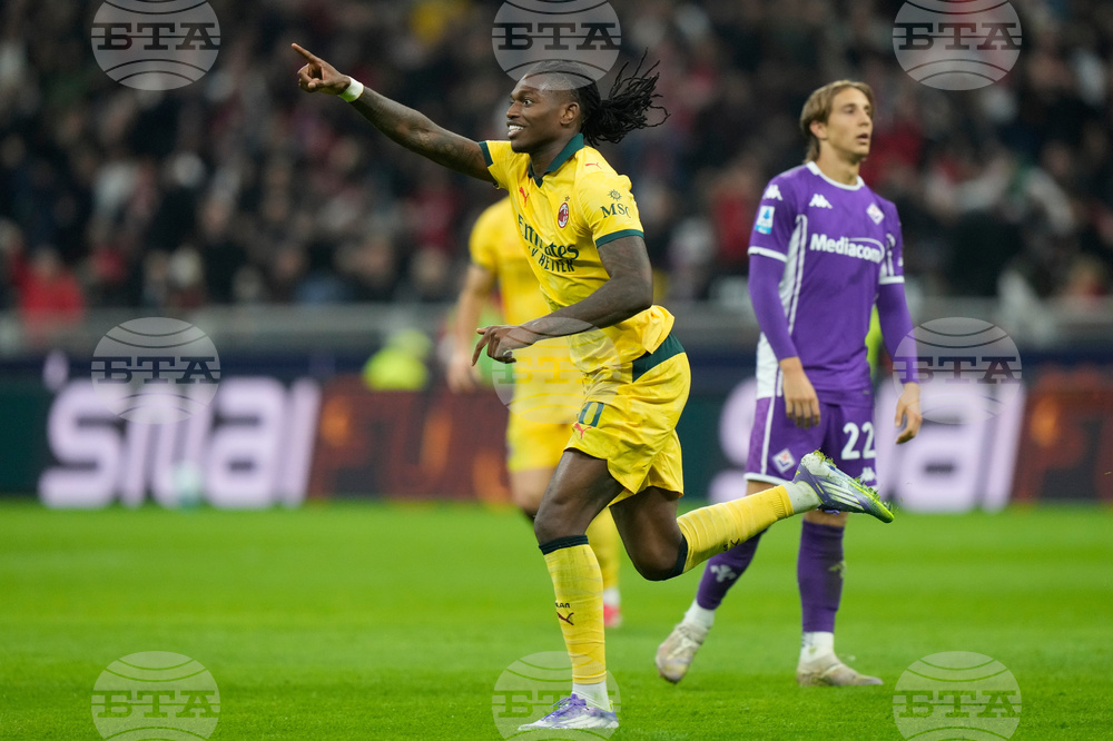 AC Milan's Rafael Leao, left, scores his side's first goal during a Serie A soccer match between AC Milan and Fiorentina in Milan, Italy, Sunday, Oct. 19, 2025. (AP Photo/Luca Bruno)