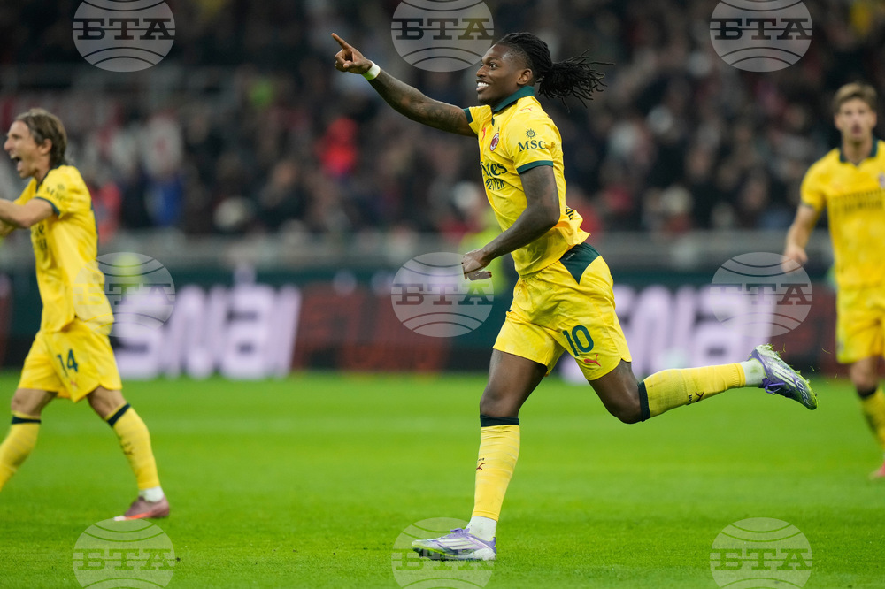 AC Milan's Rafael Leao celebrates scoring his side's first goal during a Serie A soccer match between AC Milan and Fiorentina in Milan, Italy, Sunday, Oct. 19, 2025. (AP Photo/Luca Bruno)