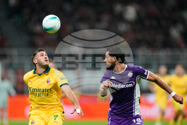 AC Milan's Rafael Leao, right, heads the ball past Fiorentina's Hans Nicolussi Caviglia during a Serie A soccer match between AC Milan and Fiorentina in Milan, Italy, Sunday, Oct. 19, 2025. (AP Photo/Luca Bruno)