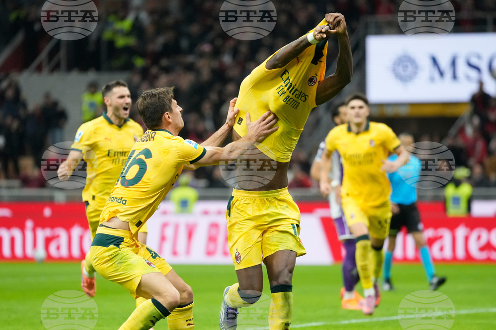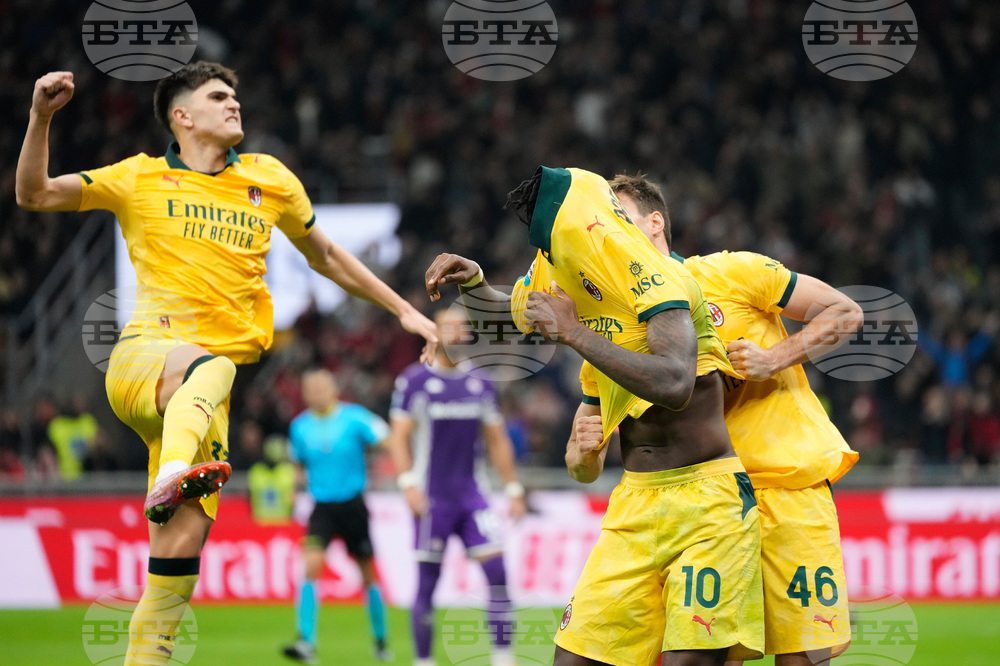 AC Milan's Rafael Leao, right, is congratulated by Youssouf Fofana after scoring his side's 2nd goal during a Serie A soccer match between AC Milan and Fiorentina in Milan, Italy, Sunday, Oct. 19, 2025. (AP Photo/Luca Bruno)