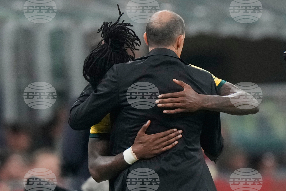 AC Milan's head coach Massimiliano Allegri, front, congrats Rafael Leao after their side's second goal during a Serie A soccer match between AC Milan and Fiorentina in Milan, Italy, Sunday, Oct. 19, 2025. (AP Photo/Luca Bruno)