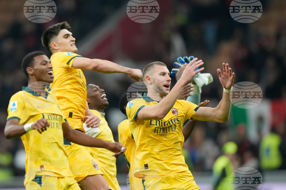 AC Milan's players celebrate after a Serie A soccer match between AC Milan and Fiorentina in Milan, Italy, Sunday, Oct. 19, 2025. (AP Photo/Luca Bruno)