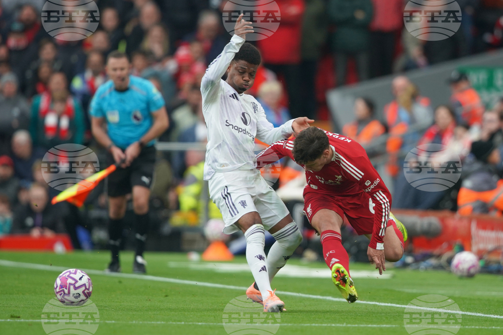 Liverpool's Milos Kerkez, right, challenges for the ball with Manchester United's Amad Diallo during the English Premier League soccer match between Liverpool and Manchester United in Liverpool, England, Sunday, Oct. 19, 2025. (AP Photo/Ian Hodgson)