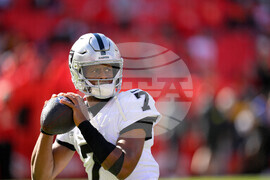 Las Vegas Raiders quarterback Geno Smith warms up before an NFL football game against the Kansas City Chiefs Sunday, Oct. 19, 2025, in Kansas City, Mo. (AP Photo/Reed Hoffmann)