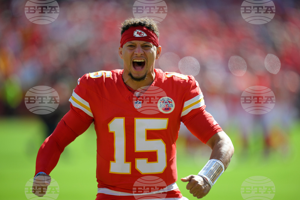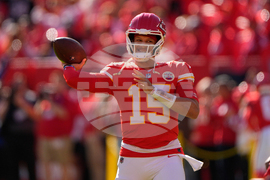Kansas City Chiefs quarterback Patrick Mahomes warms up before an NFL football game against the Las Vegas Raiders Sunday, Oct. 19, 2025, in Kansas City, Mo. (AP Photo/Charlie Riedel)