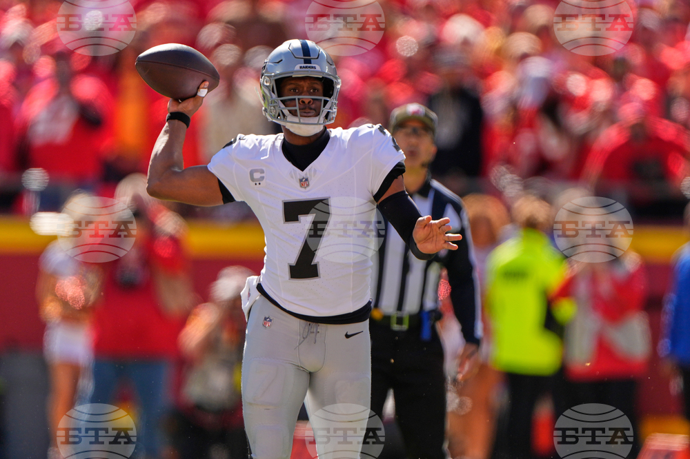 Las Vegas Raiders quarterback Geno Smith throws during the first half of an NFL football gameagainst the Kansas City Chiefs Sunday, Oct. 19, 2025, in Kansas City, Mo. (AP Photo/Charlie Riedel)