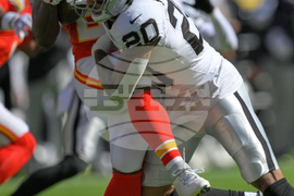 Kansas City Chiefs running back Kareem Hunt is stopped by Las Vegas Raiders safety Isaiah Pola-Mao (20) during the first half of an NFL football game Sunday, Oct. 19, 2025, in Kansas City, Mo. (AP Photo/Reed Hoffmann)