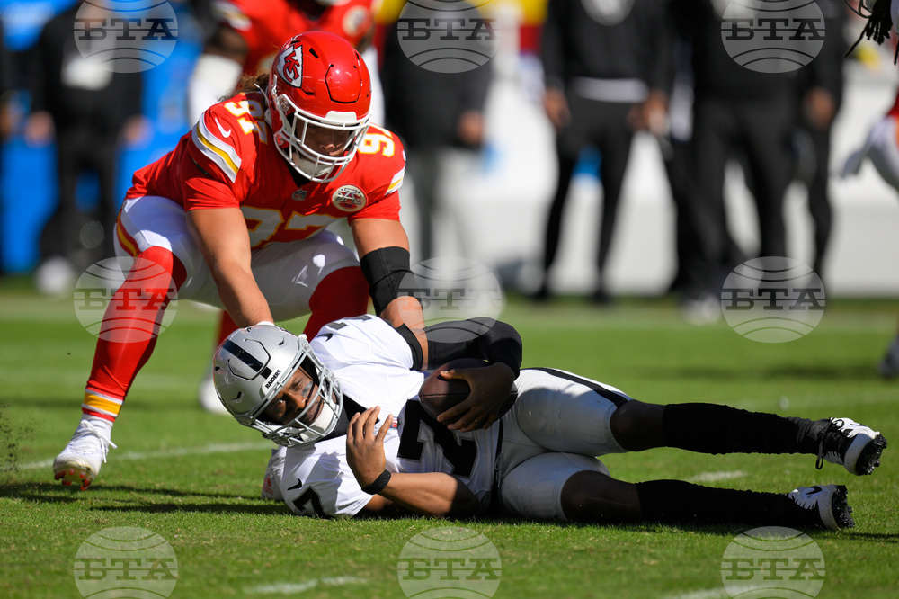 Las Vegas Raiders wide receiver Tre Tucker, center, is tackled by Kansas City Chiefs cornerback Jaylen Watson, left, and linebacker Drue Tranquill, right, during the first half of an NFL football game Sunday, Oct. 19, 2025, in Kansas City, Mo. (AP Photo/Charlie Riedel)