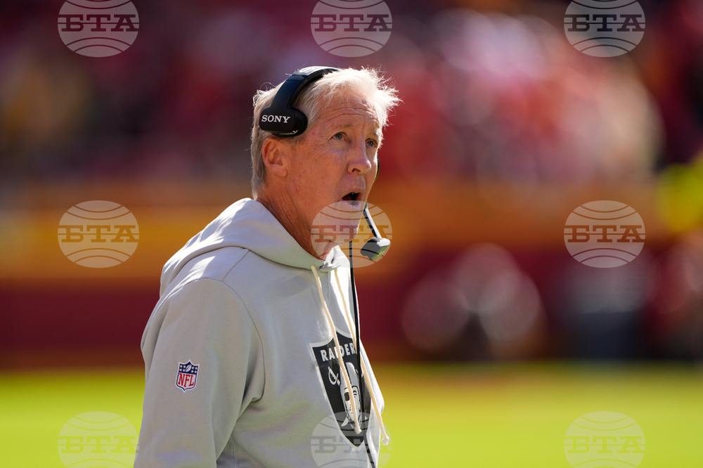 Las Vegas Raiders head coach Pete Carroll watches from the sidelines during the first half of an NFL football game against the Kansas City Chiefs Sunday, Oct. 19, 2025, in Kansas City, Mo. (AP Photo/Charlie Riedel)