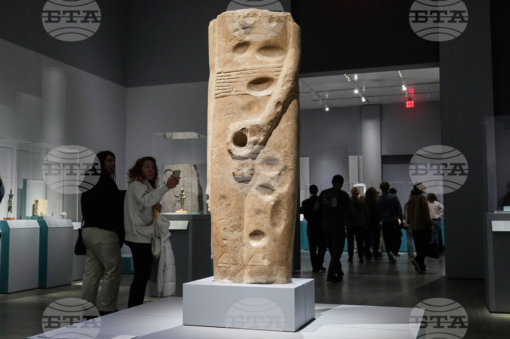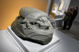 A monumental scarab is displayed in the Divine Egypt exhibition, at the Metropolitan Museum of Art, in New York, Tuesday, Oct. 14, 2025. (AP Photo/Richard Drew)