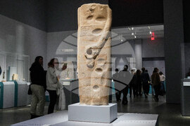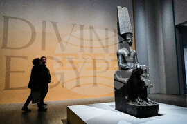 A relief of Maat is displayed in the Divine Egypt exhibition, at the Metropolitan Museum of Art, in New York, Tuesday, Oct. 14, 2025. (AP Photo/Richard Drew)