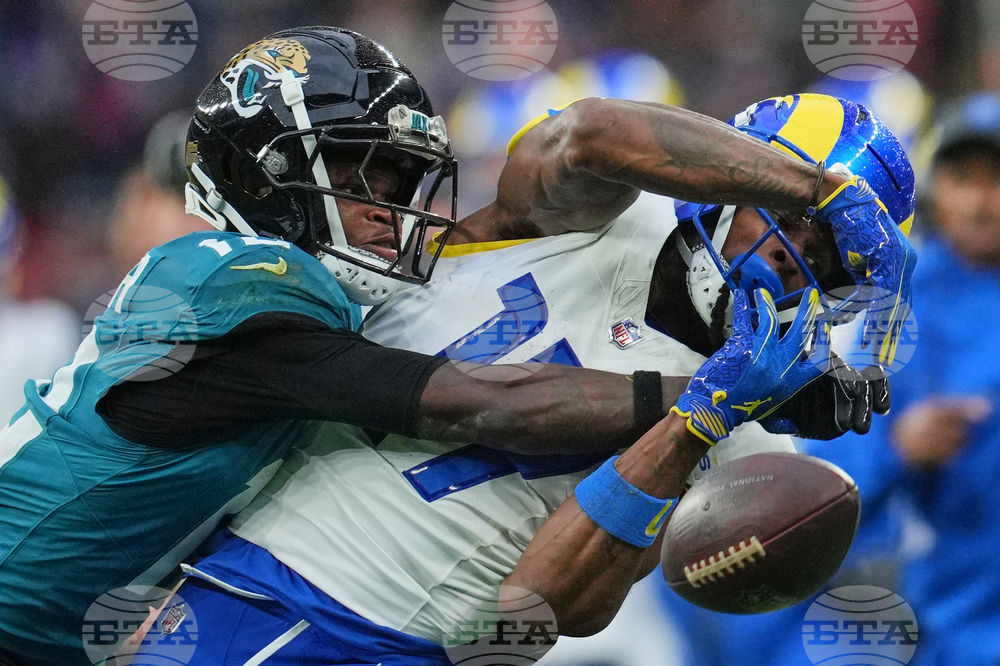 Los Angeles Rams wide receiver Davante Adams (17) is challenged by Jacksonville Jaguars wide receiver Travis Hunter (12) during the second half of an NFL football game between the Los Angeles Rams and the Jacksonville Jaguars in London, Sunday, Oct. 19, 2025. (AP Photo/Kin Cheung)