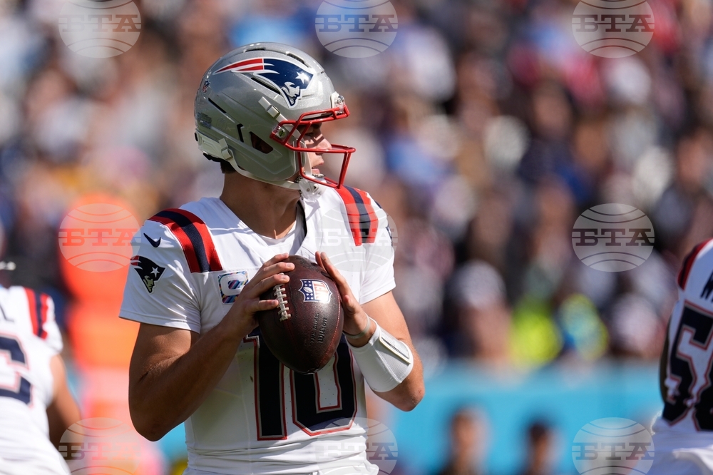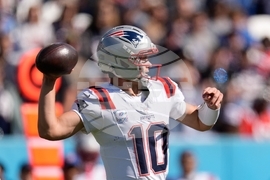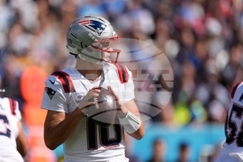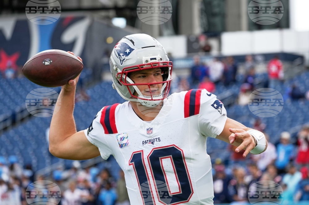 New England Patriots quarterback Drake Maye (10) throws before an NFL football game against the Tennessee Titans, Sunday, Oct. 19, 2025, in Nashville, Tenn. (AP Photo/John Amis)