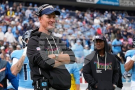 Tennessee Titans interim head coach Mike McCoy watches before an NFL football game against the New England Patriots, Sunday, Oct. 19, 2025, in Nashville, Tenn. (AP Photo/George Walker IV)