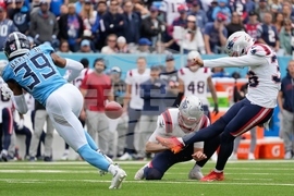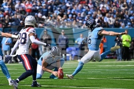 Tennessee Titans place-kicker Joey Slye (6) kicks a field goal out of the hold of punter Johnny Hekker (3) during the first half of an NFL football game against the New England Patriots, Sunday, Oct. 19, 2025, in Nashville, Tenn. (AP Photo/John Amis)