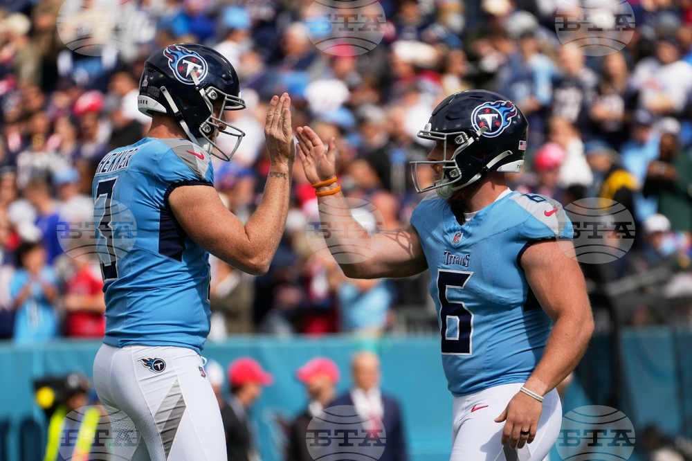 Tennessee Titans place-kicker Joey Slye, right, celebrates a field goal with punter Johnny Hekker (3) during the first half of an NFL football game against the New England Patriots, Sunday, Oct. 19, 2025, in Nashville, Tenn. (AP Photo/George Walker IV)