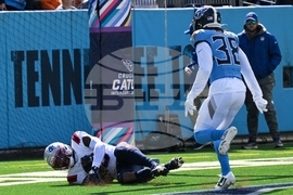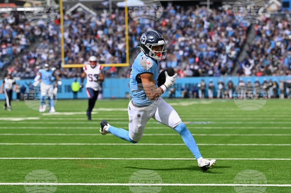 Tennessee Titans wide receiver Chimere Dike (17) makes a touchdown catch during the first half of an NFL football game against the New England Patriots, Sunday, Oct. 19, 2025, in Nashville, Tenn. (AP Photo/John Amis)