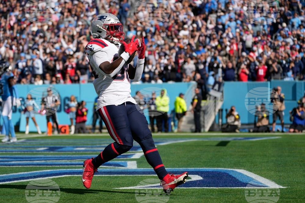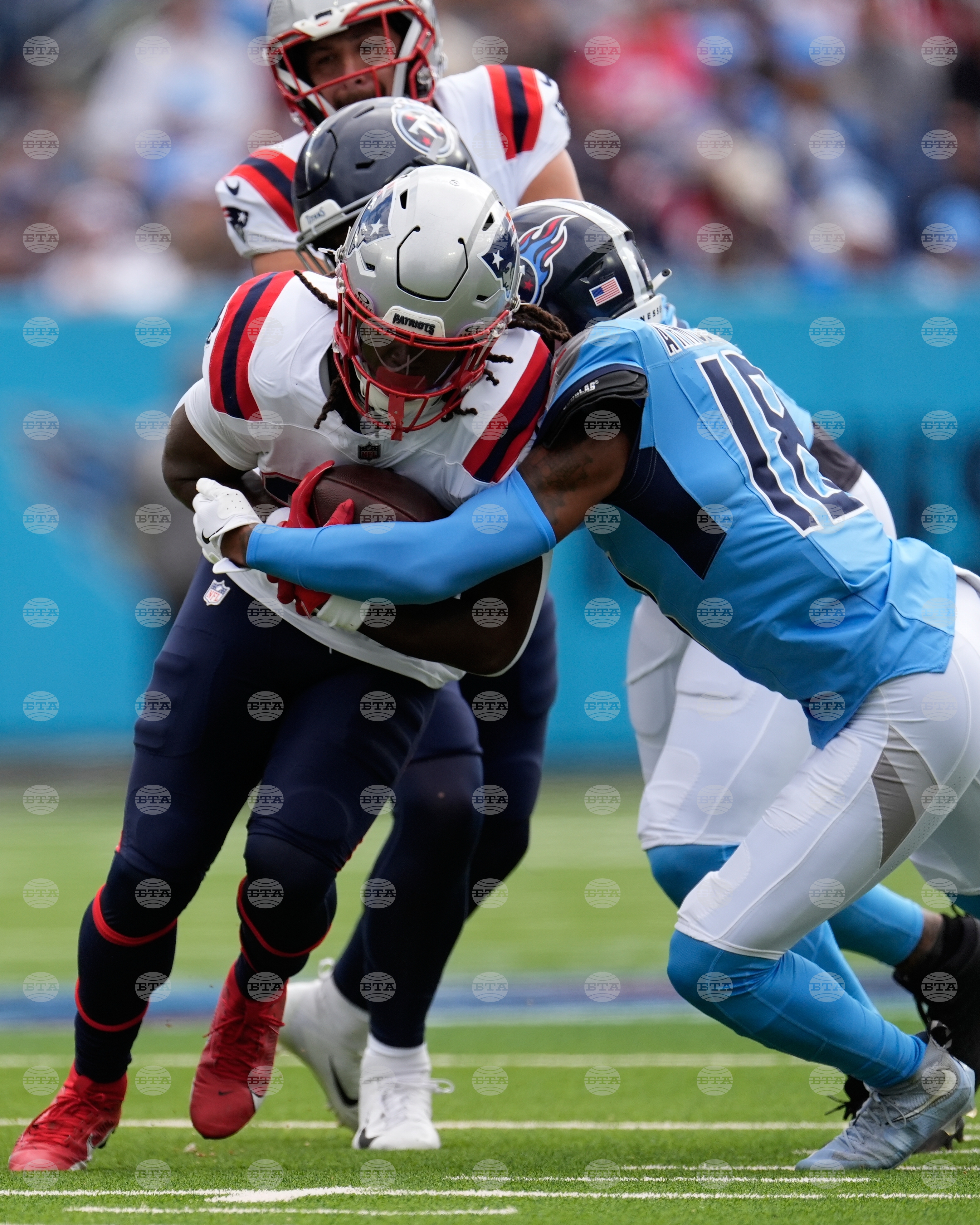 New England Patriots running back Rhamondre Stevenson (38) is tackled by Tennessee Titans defensive end Sebastian Joseph-Day (69) during the first half of an NFL football game, Sunday, Oct. 19, 2025, in Nashville, Tenn. (AP Photo/George Walker IV)