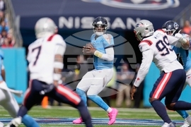 Tennessee Titans quarterback Cam Ward (1) looks to throw during the first half of an NFL football game against the New England Patriots, Sunday, Oct. 19, 2025, in Nashville, Tenn. (AP Photo/George Walker IV)
