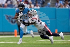 Tennessee Titans wide receiver Van Jefferson (11) runs for a first down against New England Patriots defensive end Milton Williams (97) and safety Kyle Dugger (23) during the first half of an NFL football game, Sunday, Oct. 19, 2025, in Nashville, Tenn. (AP Photo/George Walker IV)