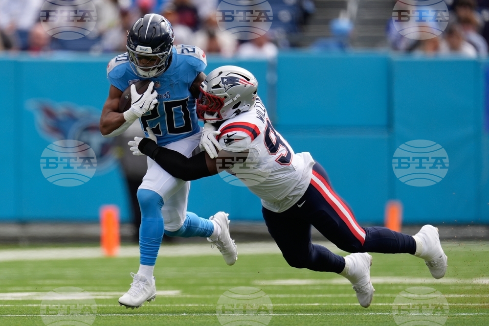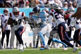 Tennessee Titans running back Tony Pollard (20) is tackled by New England Patriots defensive end Milton Williams (97) during the first half of an NFL football game, Sunday, Oct. 19, 2025, in Nashville, Tenn. (AP Photo/George Walker IV)