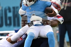 Tennessee Titans quarterback Cam Ward (1) is tackled by New England Patriots linebacker K'Lavon Chaisson (44) during the first half of an NFL football game, Sunday, Oct. 19, 2025, in Nashville, Tenn. (AP Photo/John Amis)