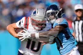New England Patriots quarterback Drake Maye (10) is tackled by New England Patriots safety Jaylinn Hawkins (21) during the second half of an NFL football game, Sunday, Oct. 19, 2025, in Nashville, Tenn. (AP Photo/George Walker IV)