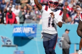 New England Patriots quarterback Joshua Dobbs (11) throws during the second half of an NFL football game against the Tennessee Titans, Sunday, Oct. 19, 2025, in Nashville, Tenn. (AP Photo/George Walker IV)