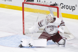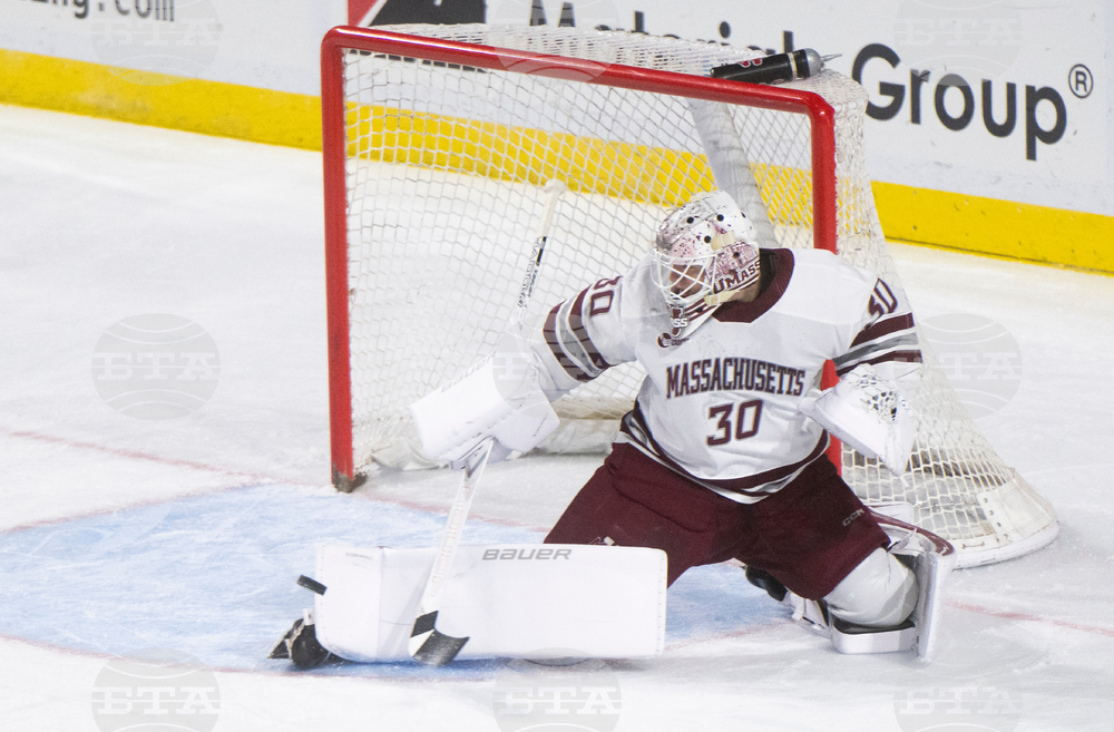 UMass goalie Michael Hrabal blocks a shot during the NCAA college hockey game against Bentley at the Mullins Center in Amherst, Mass., Saturday, Oct. 18, 2025. (Daniel Jacobi II//The Daily Hampshire Gazette via AP)