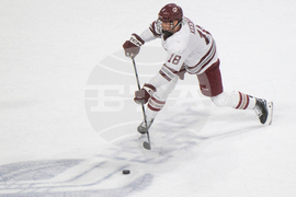 UMass defenseman Larry Keenan passes the puck during the NCAA college hockey game against Bentley at the Mullins Center in Amherst, Mass., Saturday, Oct. 18, 2025. (Daniel Jacobi II/The Daily Hampshire Gazette via AP)