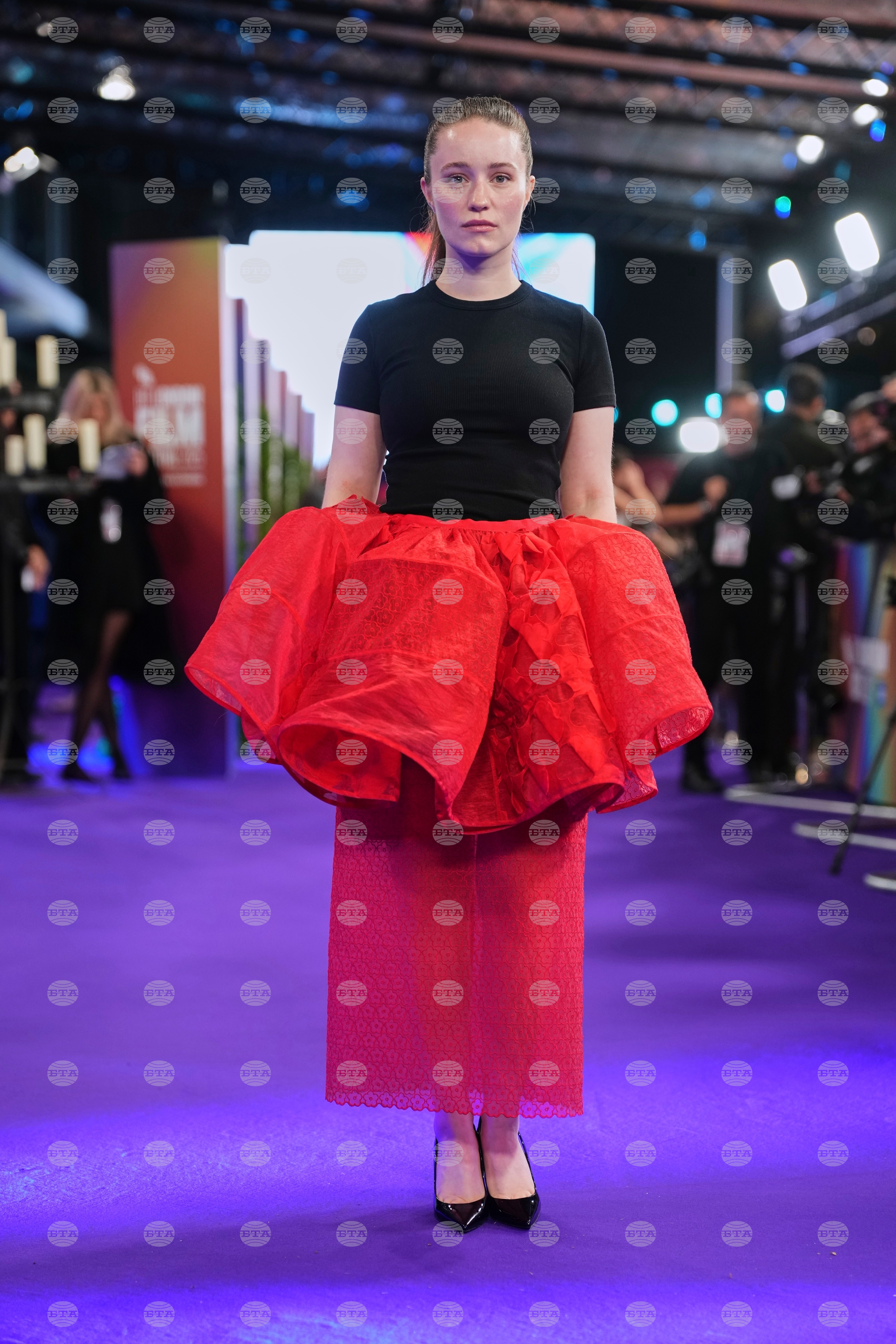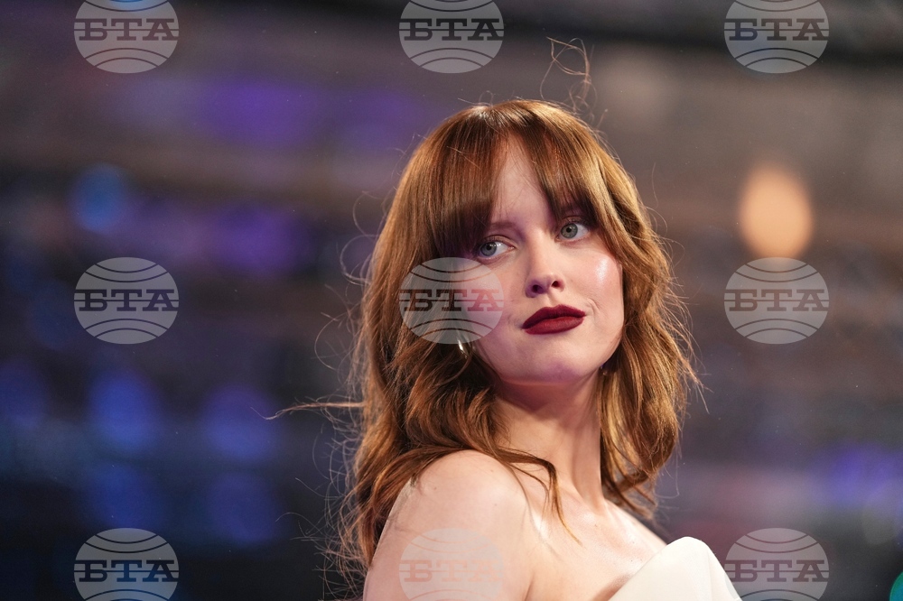 Maika Monroe poses for photographers upon arrival at the premiere of the film "100 Nights of Hero" which closes the London film festival in London, Sunday, Oct. 19, 2025. (Photo by Scott A Garfitt/Invision/AP)