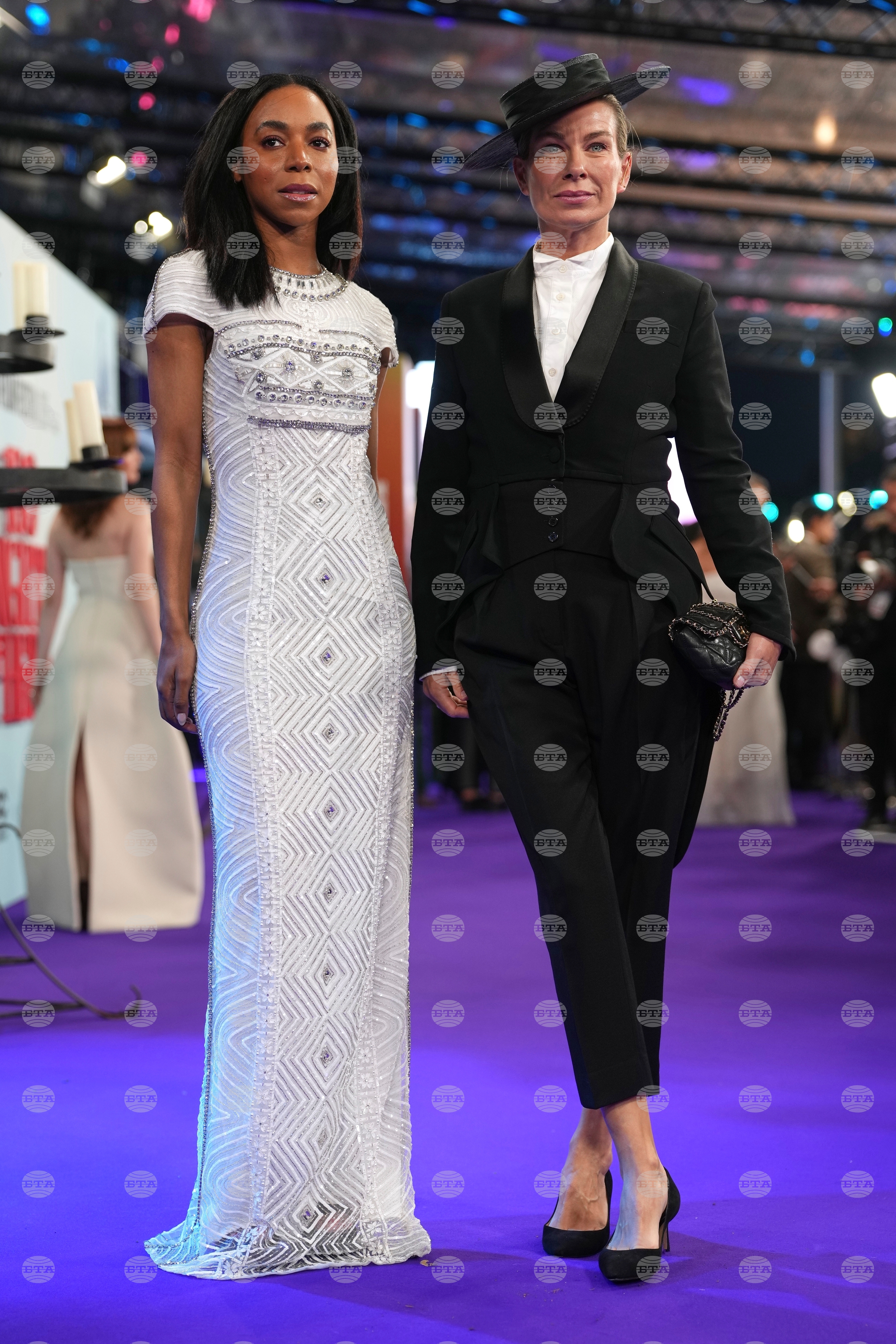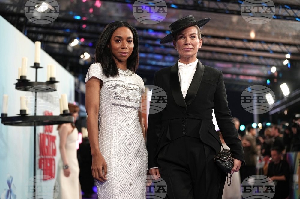 Pippa Bennett-Warner, left, and Pippa Vosper pose for photographers upon arrival at the premiere of the film "100 Nights of Hero" which closes the London film festival in London, Sunday, Oct. 19, 2025. (Photo by Scott A Garfitt/Invision/AP)