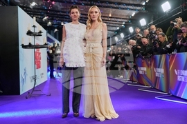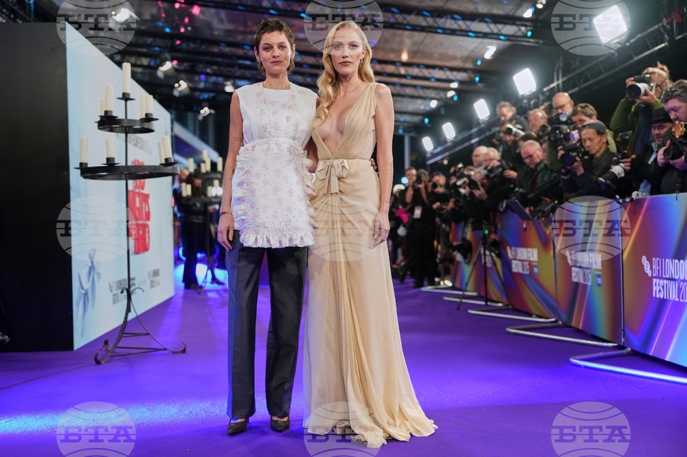 Emma Corrin, left, and Maika Monroe pose for photographers upon arrival at the premiere of the film "100 Nights of Hero" which closes the London film festival in London, Sunday, Oct. 19, 2025. (Photo by Scott A Garfitt/Invision/AP)