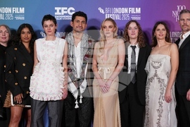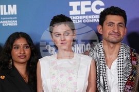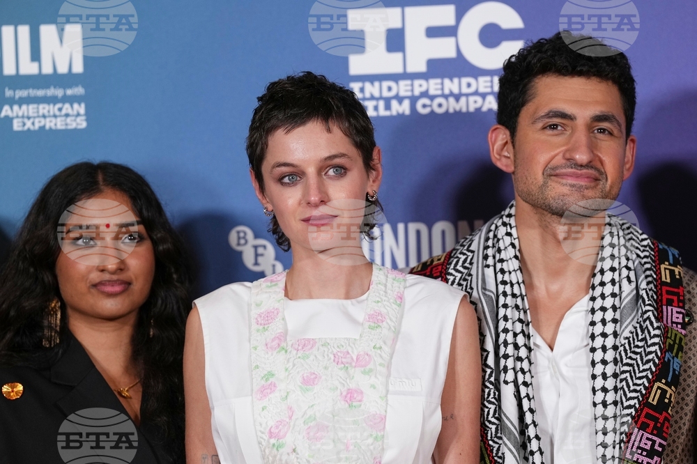 Varada Sethu, from left, Emma Corrin and Amir El-Masry pose for photographers upon arrival at the premiere of the film "100 Nights of Hero" which closes the London film festival in London, Sunday, Oct. 19, 2025. (Photo by Scott A Garfitt/Invision/AP)
