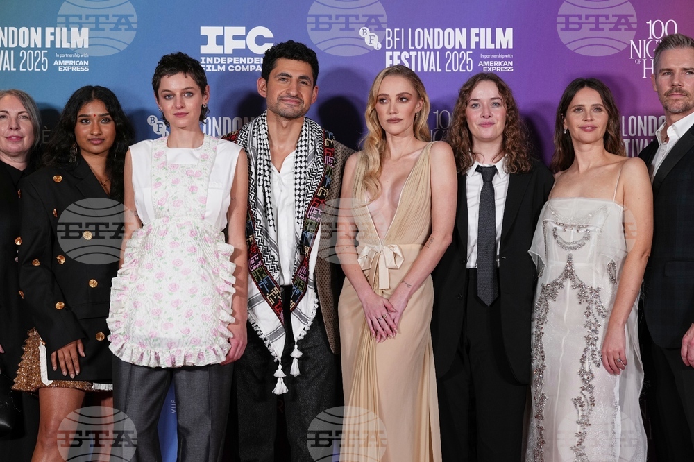 Susie Coulthard, from left, Varada Sethu, Emma Corrin, Amir El-Masry, Maika Monroe, director Julia Jackman, Felicity Jones and Josh Cowdery pose for photographers upon arrival at the premiere of the film "100 Nights of Hero" which closes the London film festival in London, Sunday, Oct. 19, 2025. (Photo by Scott A Garfitt/Invision/AP)