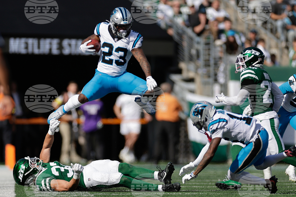 Carolina Panthers running back Trevor Etienne (23) carries the ball against the New York Jets during the second quarter of an NFL football game, Sunday, Oct. 19, 2025, in East Rutherford, N.J. (AP Photo/Adam Hunger)