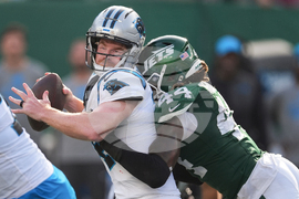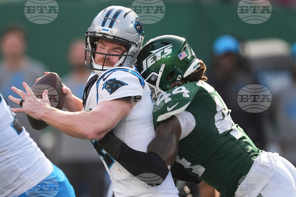 Carolina Panthers quarterback Andy Dalton (14) is sacked by New York Jets linebacker Jamien Sherwood (44) during the fourth quarter of an NFL football game, Sunday, Oct. 19, 2025, in East Rutherford, N.J. (AP Photo/Seth Wenig)
