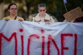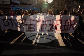 People holding a banner that reads "Stop Femicides" take part in a protest aiming to raise awareness to the violence and prejudice against women in Romanian society in Bucharest, Romania, Sunday, Oct. 19, 2025. (AP Photo/Andreea Alexandru)