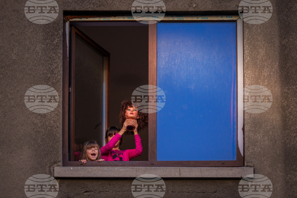 Children cheer and wave a mannequin's head while watching people take part in a protest aiming to raise awareness to the violence and prejudice against women in Romanian society in Bucharest, Romania, Sunday, Oct. 19, 2025. (AP Photo/Vadim Ghirda)